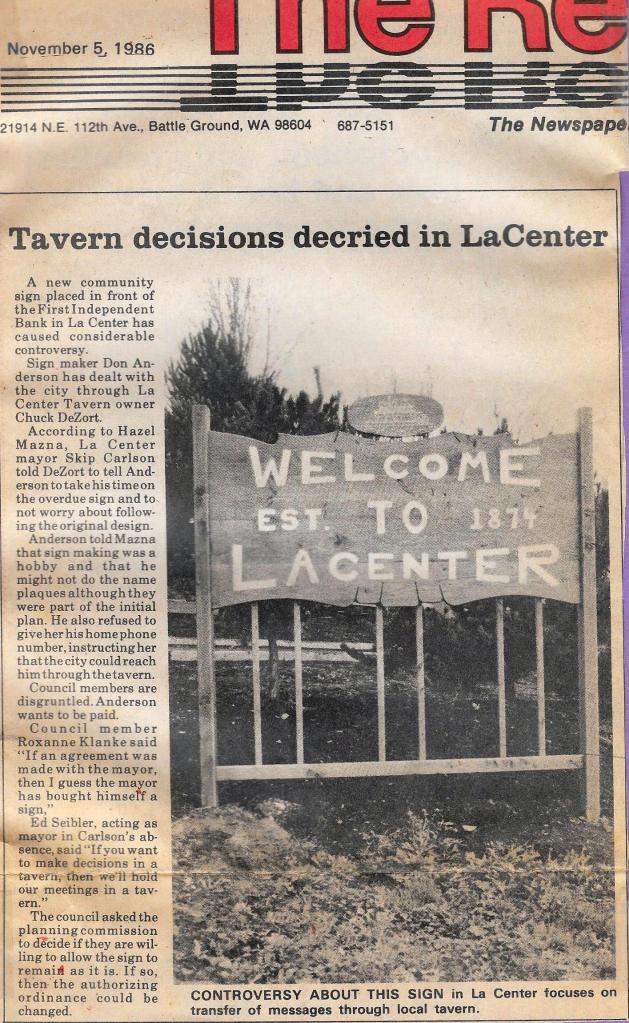 Suzi: You actually made the welcome to La Center sign that was here from 1985. When did they remove that?