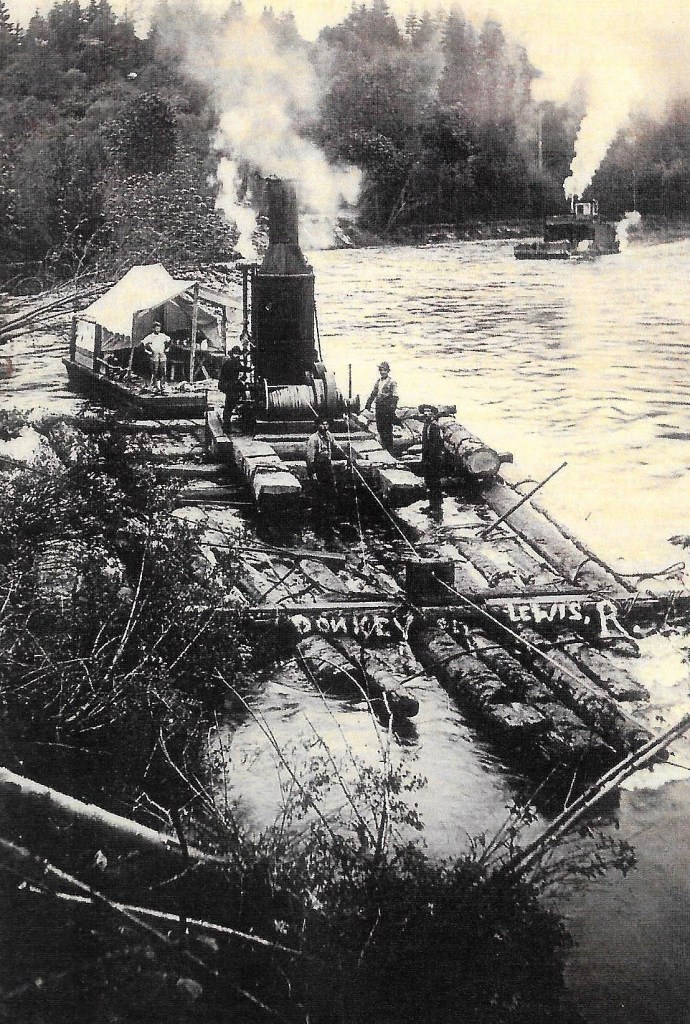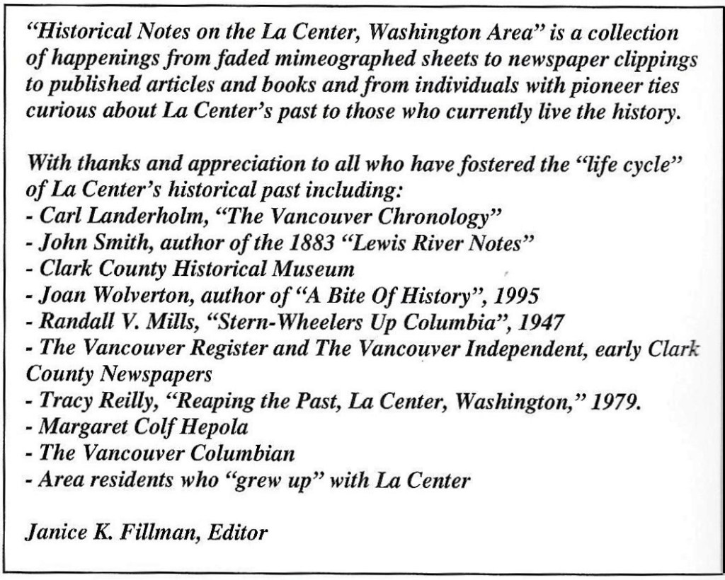 La Center’s logging industry began with the cutting of railroad ties in the late 1890’s. Within a seven mile radius there were about twelve saw mills engaged in cutting lumber and ties. These products were transported via flumes to dockside downtown and then shipped to Portland markets.