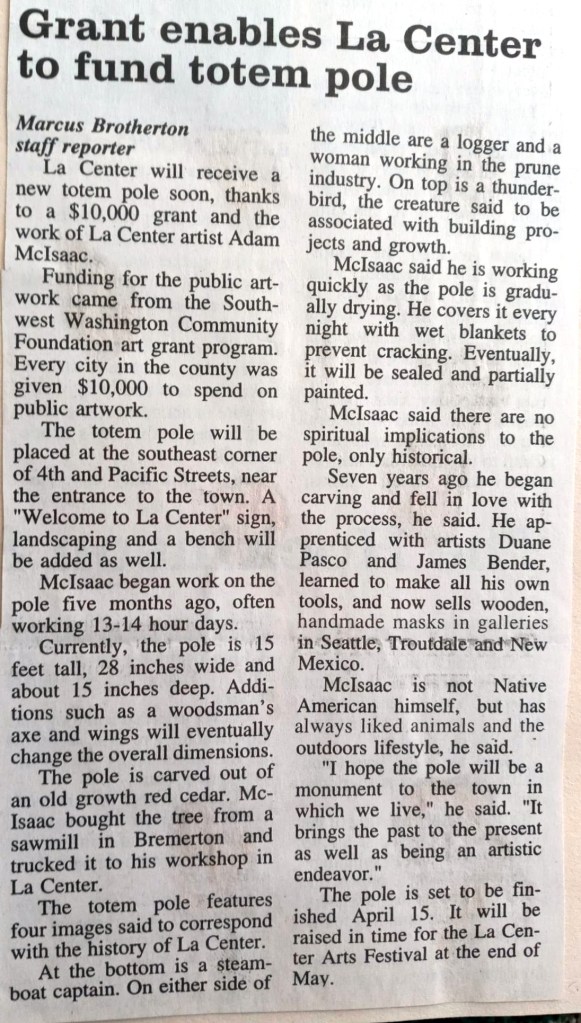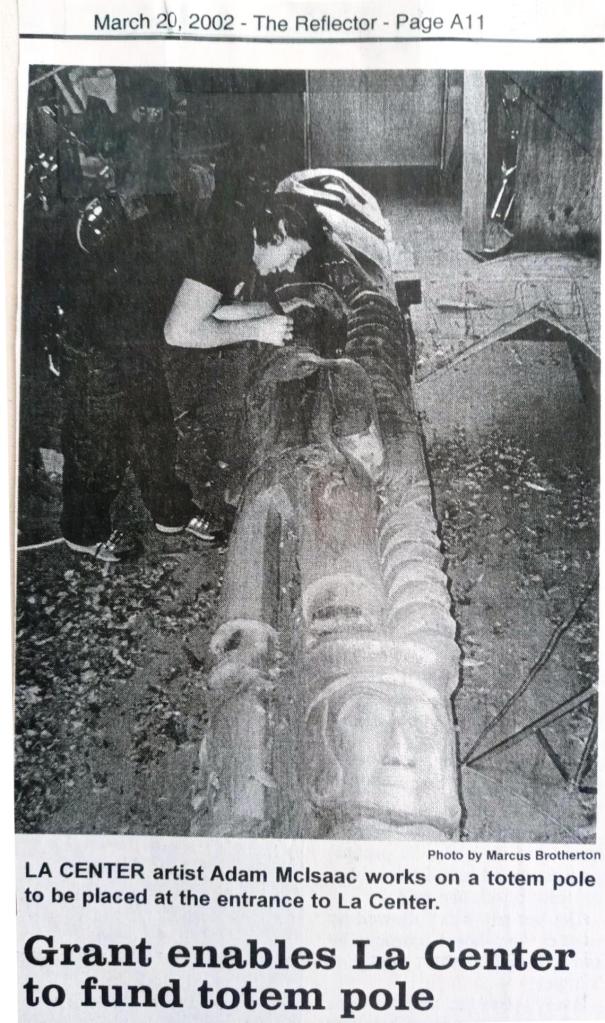 Adam McIsaac is a professional carver who has focused on Native American carvings in the Columbia River Basin for 30 years. He mainly does commissions and has many in Washington and Oregon. He teaches carving in this style from time to time and also teaches how to make crooked knives and adzes. His studio is in La Center, WA just north of Vancouver.