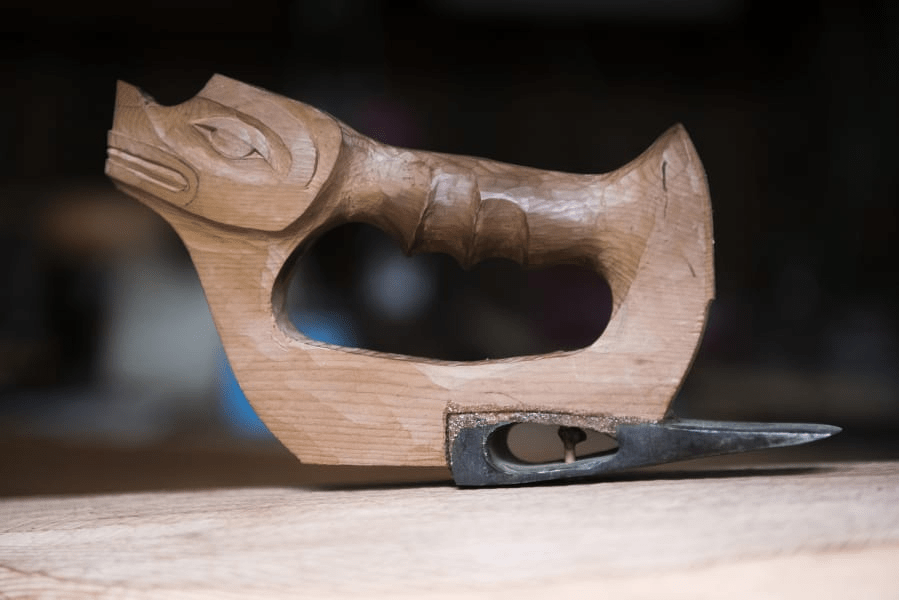 Carver Adam McIsaac makes most of his own tools, like this D-adze. “Each individual tool becomes an extension of your arm,” he said. (Nathan Howard/The Columbian) Photo Gallery