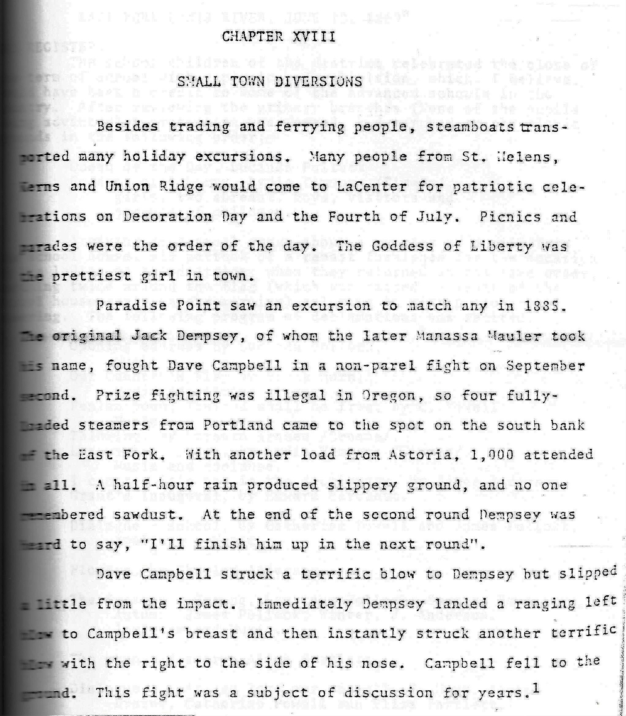 Some articles claimed the match was held on the south bank of the Lewis River at Paradise Point, others simply stated it was in Washington Territory or in the wilds of the Pacific Northwest”. One interview given well over 40yr after the fight, said it was at Paradise Point. Yet one other stated it was up the Lewis River at the farm of J. Specht.
