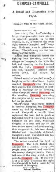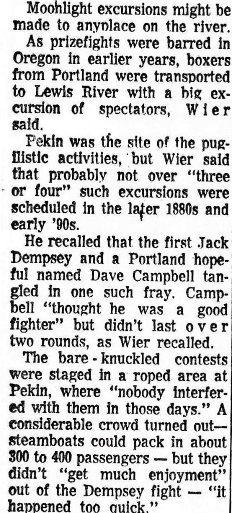 Tickets ran high at $5 for these “moonlight excursions” as they were promoted. Steamers left in the dark of night giving only an “undisclosed destination”, telling passengers the match would take place within 100 miles of Portland. They came from the Willamette to the Columbia and on to the Lewis River, cloud in secrecy. Others came from Astoria – each steamer carrying 100’s of fans, drinking and betting on the out come.