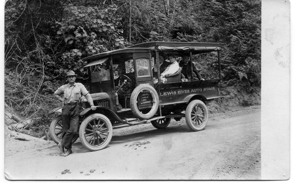 My great-grandparents, the Andrew Jackson Birts, came to the Lewis River Valley in 1870 when homes were located many miles apart. In fact, great-grandfather came before 1870 on his first journey from California, and then traveled by canoe up the river to find a likely spot for a homestead. He had a farm of 250 acres in the San Joaquin Valley of California, but he had an adventurous spirit that urged him to come north and settle in the wilderness. He filed a homestead claim, returned to California, and brought back his wife and nine children to start a new life about one mile east of the present Merwin Dam, which would be almost in the middle of the bottom of the present lake.
