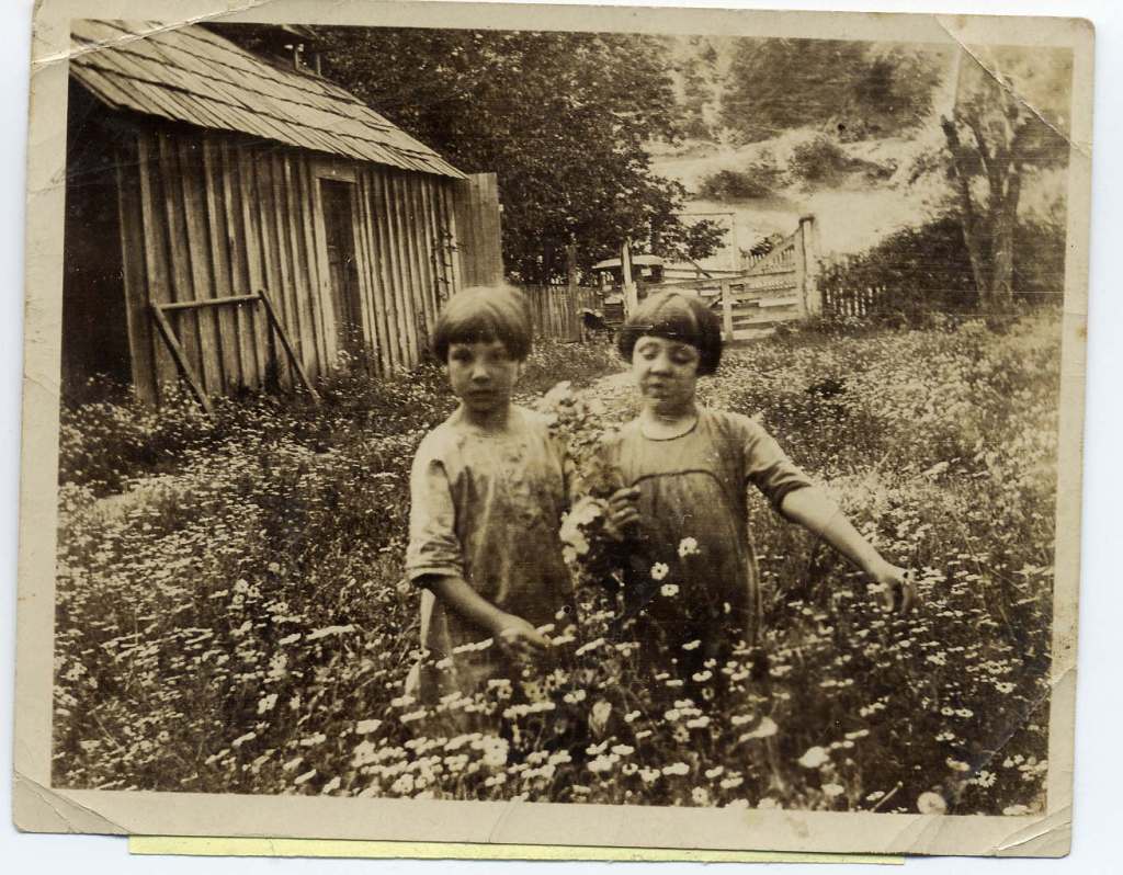 Our home was surrounded with a large yard, which had five old locust trees towering over the buildings. Part of the yard area was blanketed with a ground cover of myrtle. There were many flowers which had grown there since the 1800s. A picket fence enclosed the yard area, house, woodshed, rootcellar, separator building to store and separate the cream from the milk, and the outhouse. Our home sat on a little shelf of land above the large meadow which extended to the edge of the river. Our fields were edged with a growth of alder, maple, fir, vine maple and other small bushes. Salmonberries were in many areas, too.